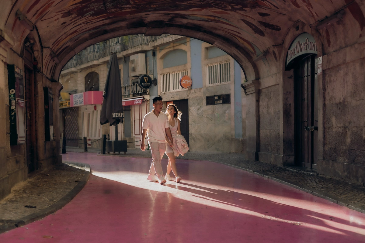 As the sun rose, Lisbon slowly awoke, and our exploration continued, as we walked up and down the hills, until we found the most wonderful light on Pink Street, in Cais do Sodré. They wanted sweet memories of their trip, so we made sure to get a bit of all of Lisbon’s typical features, such as the yellow trams and tiled houses.